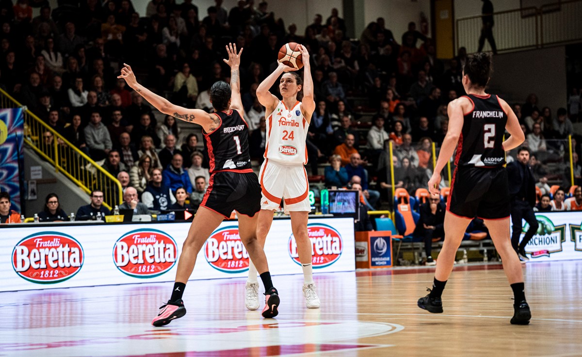 Brochant brucia subito la retina dall'arco ma il Famila è mortifero perché risponde con una doppia conclusione pesante di Panzera e un'altra di Zandalasini, sempre dallo stesso angolo: 64-38. Con un break di 16-2, però, le francesi provano a riaprire la gara complice anche un Famila che tira un po' i remi in barca e per questo viene richiamato all'ordine da coach LaPena. È la solita Shepard a interrompere il digiuno orange ma è la tripla dall'angolo di Verona a ridare ossigeno all'attacco scledense. Finisce 74-57 e ora ci si prepara alla seconda fase nella quale il Beretta affronterà Girona, Praga e Bourges.