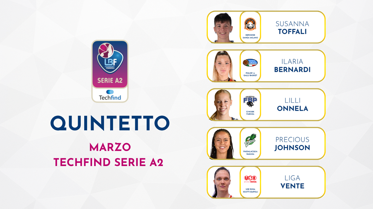 Ecco chi sono le cinque giocatrici che si sono distinte maggiormente nell'arco del mese di marzo e nell'ultima giornata giocata ad aprile di Techfind Serie A2, secondo la Lega Basket Femminile.